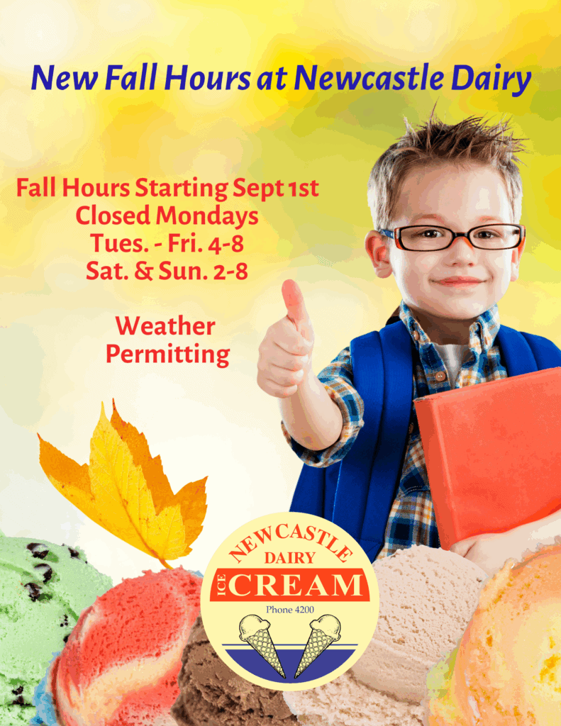 New Fall Hours begin on September 1st at Newcastle Dairy. We will be closing on Mondays, and open Tuesday to Friday 4-8, and Saturday & Sunday 2-8, weather permitting.